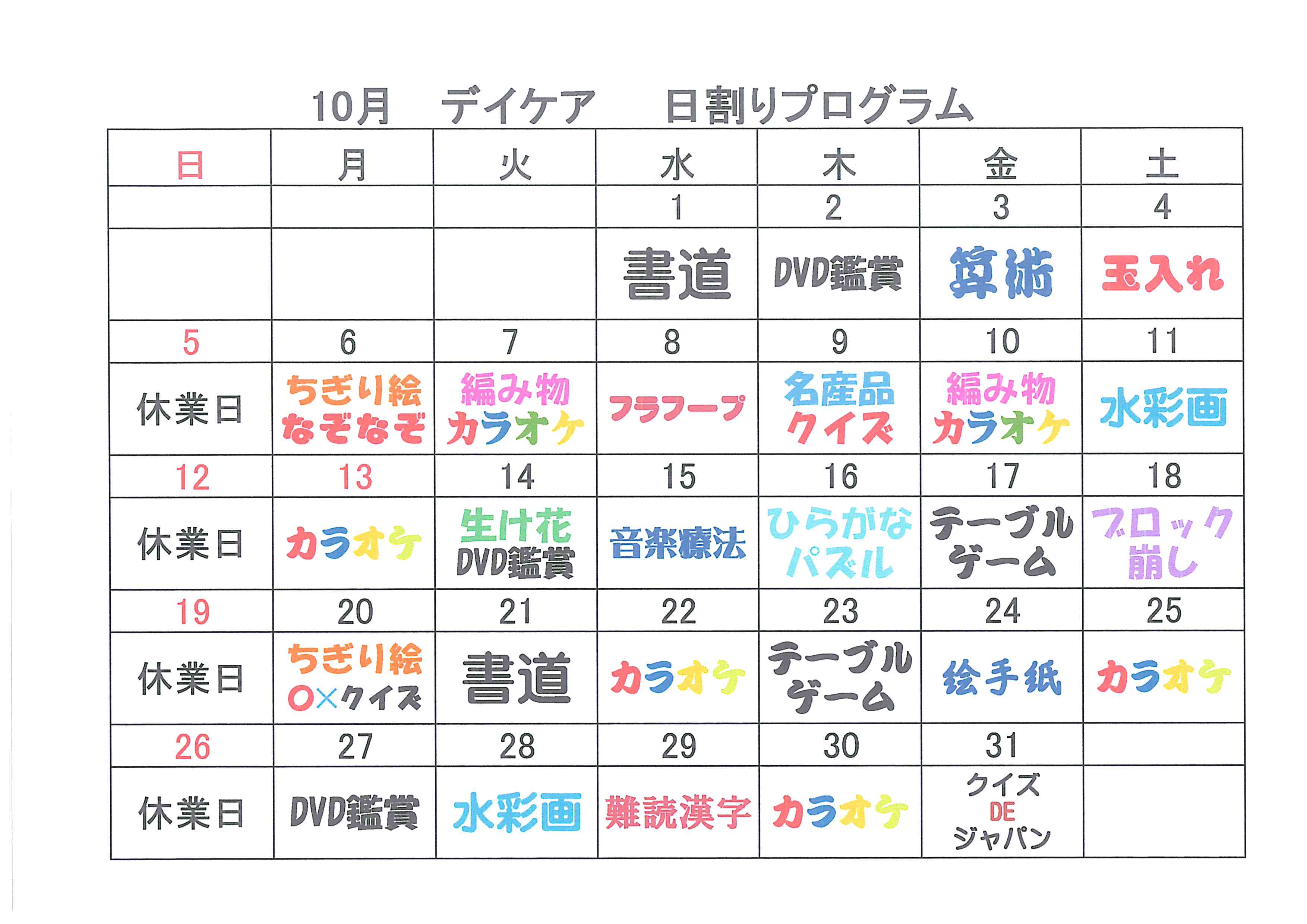デイケア令和6年10月度日割りプログラムを追加しました。