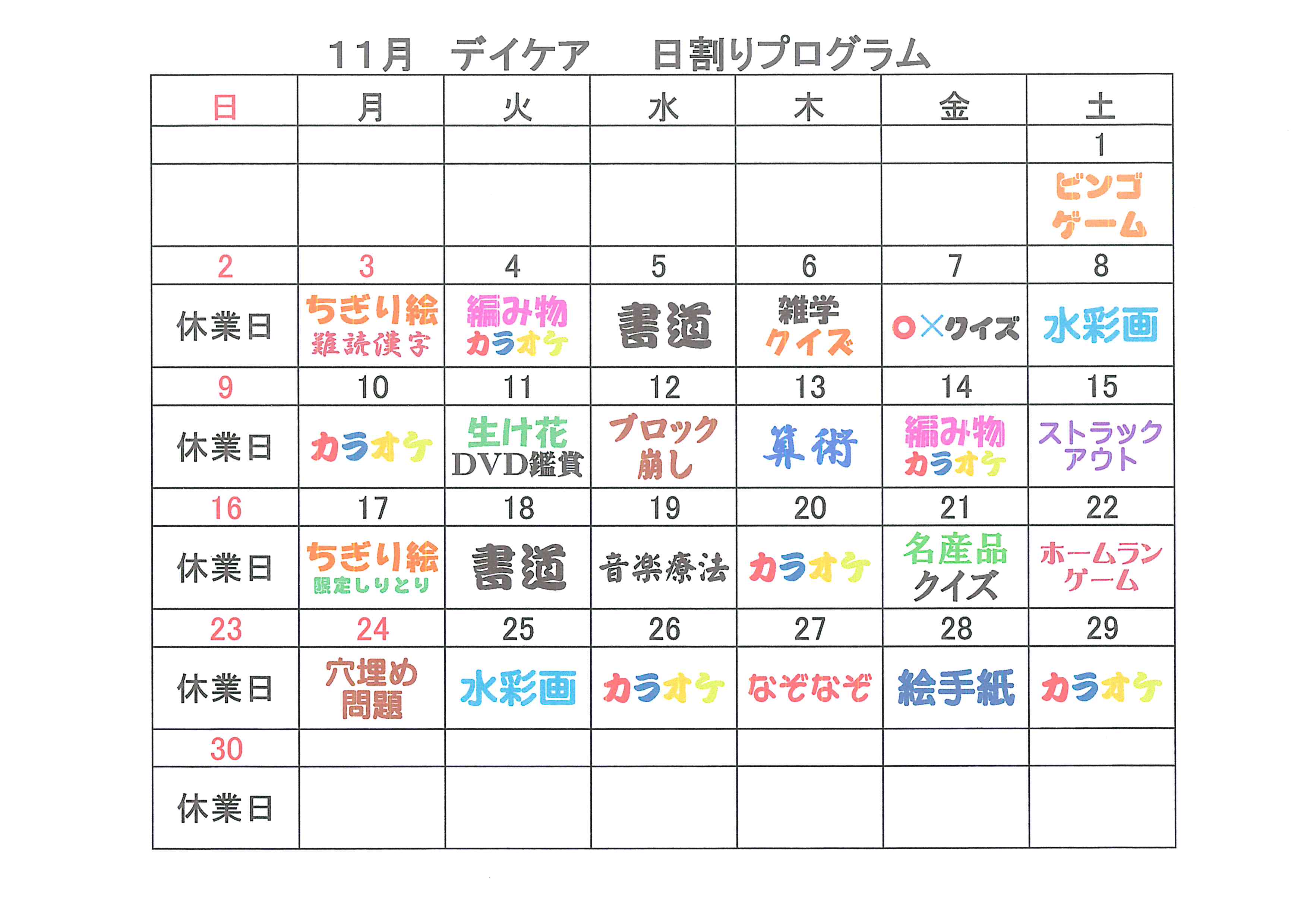 デイケア令和6年11月度日割りプログラムを追加しました。